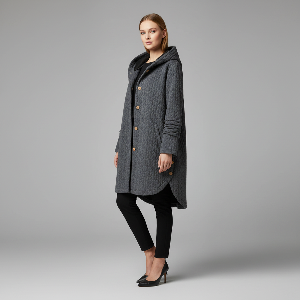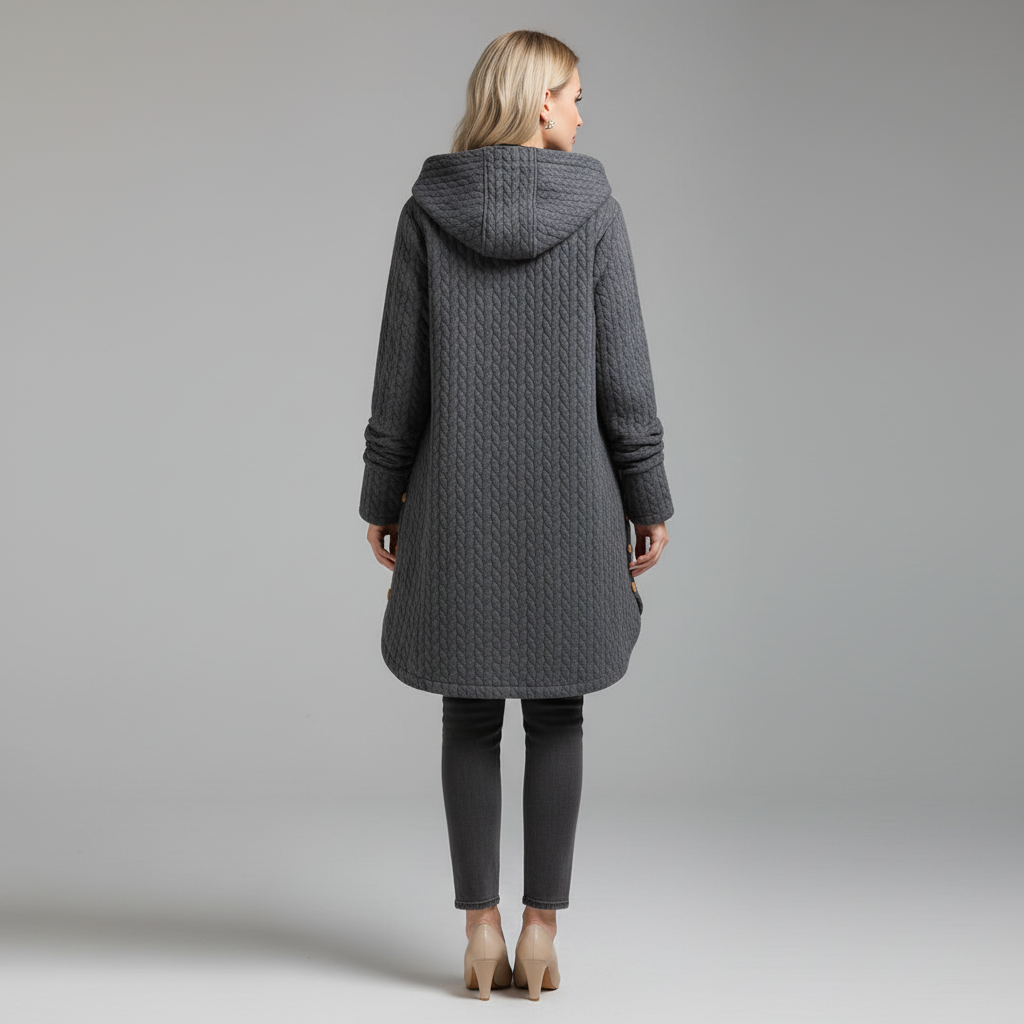 Wrap yourself in comfort and style with the Sarah Elegant Hooded Jacket. Featuring a beautiful quilted texture, this jacket brings a modern twist to classic outerwear. The long, flowing silhouette paired with a functional hood makes it perfect for chilly days. Decorative buttons along the sides add a charming touch, while the neutral gray color ensures versatility in your wardrobe.