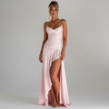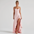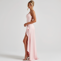 Crafted from lustrous satin, this gown glides over your figure with elegance and ease. The ultra-feminine open back with criss-cross ties adds drama, while the thigh-high slit brings just the right amount of allure. Ideal for formal nights, upscale celebrations, or any moment that calls for unforgettable glamour.