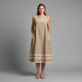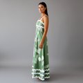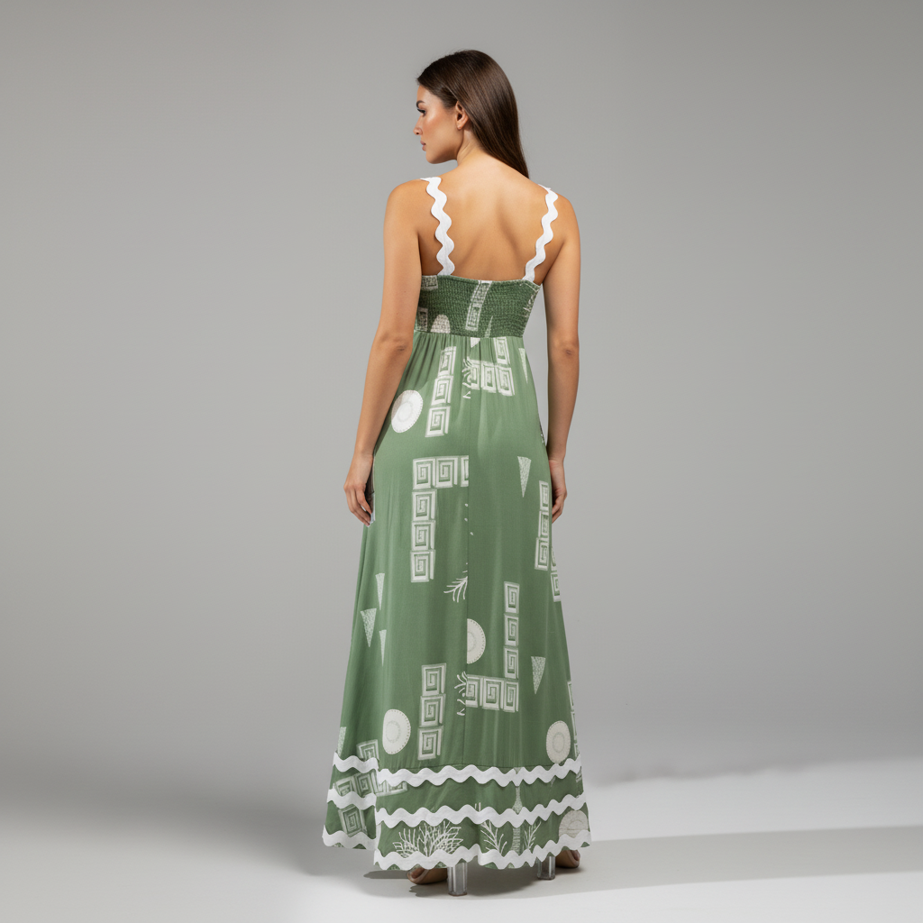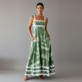 A playful printed maxi dress featuring striking white scalloped straps and trim, paired with a flowing A-line silhouette and side pockets for effortless wear. Its breezy shape and statement pattern make it ideal for warm-weather getaways, long lunches, or beachside strolls. Just add sandals and let the dress do the talking.