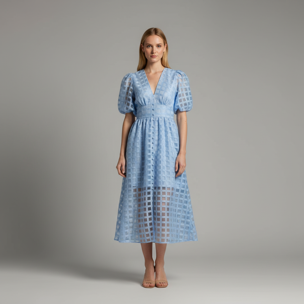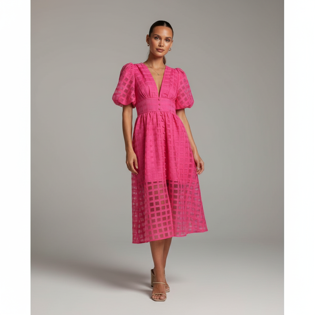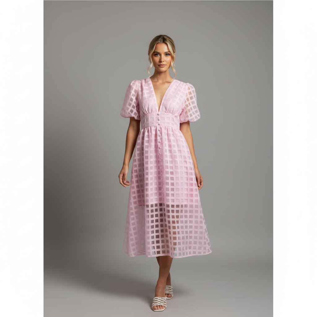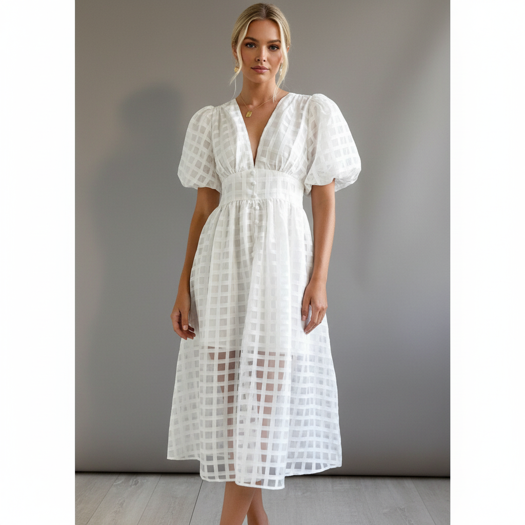 A breezy midi dress featuring a sheer grid overlay that brings subtle texture and modern flair to a timeless silhouette. The puff sleeves and deep V neckline add a feminine touch, while the fitted waist creates a flattering shape. Ideal for warm-weather days when you want to feel both stylish and effortless.