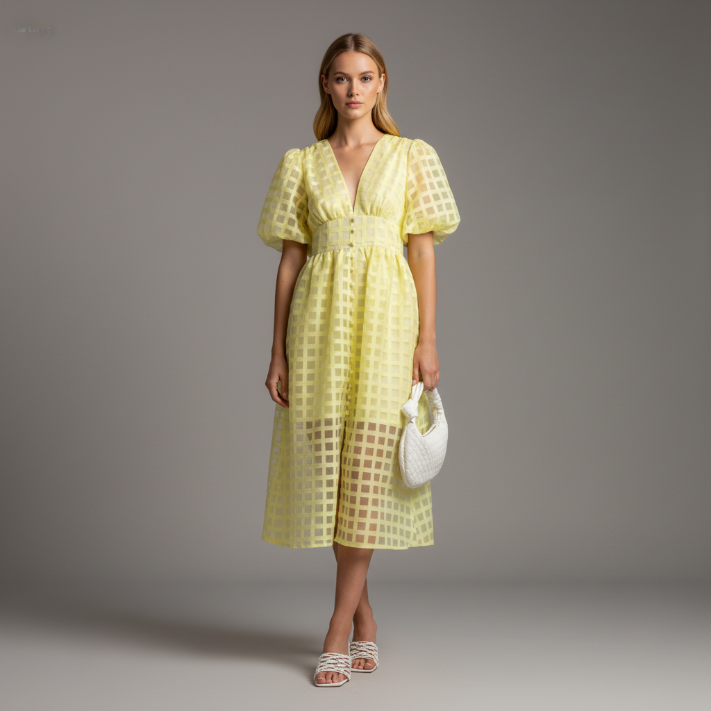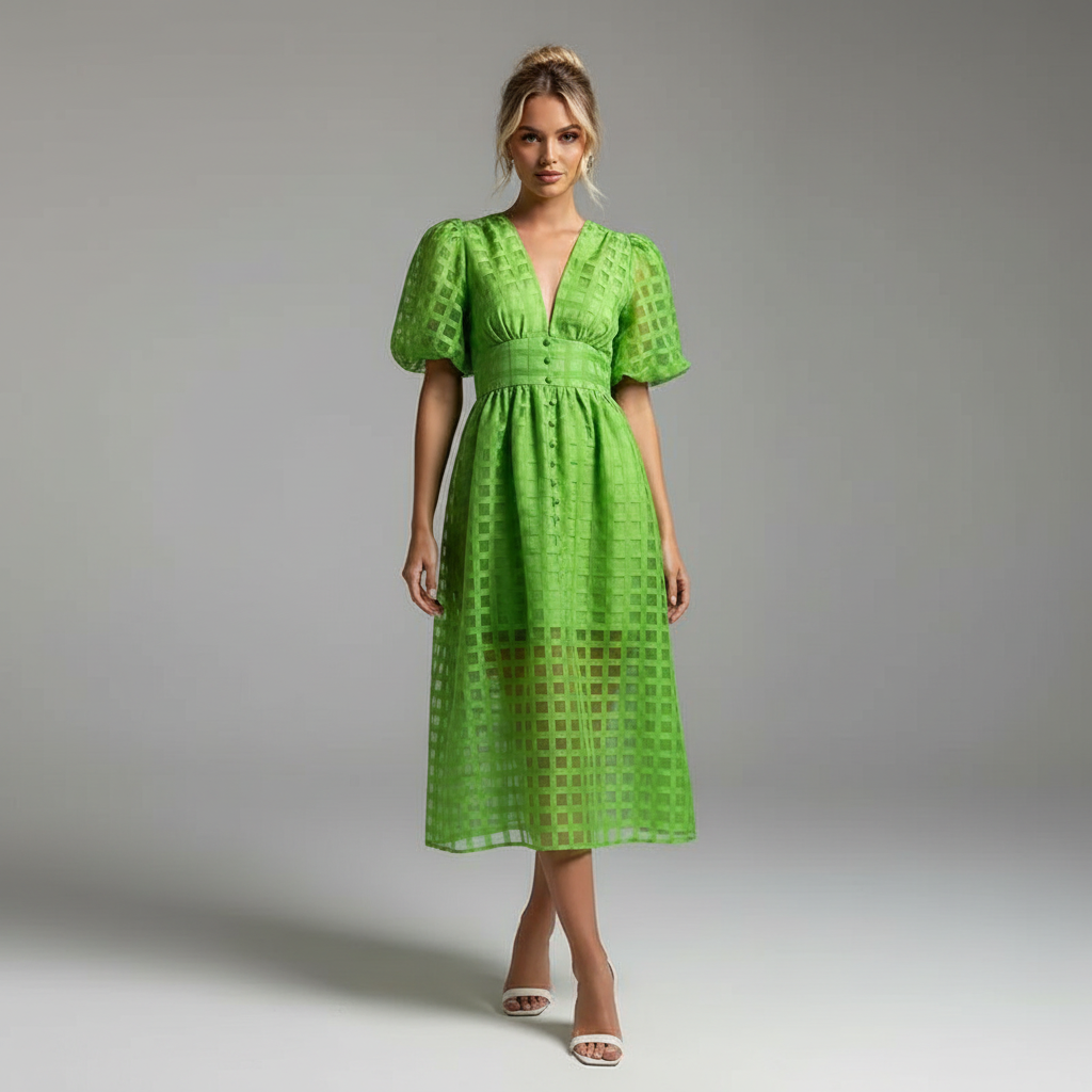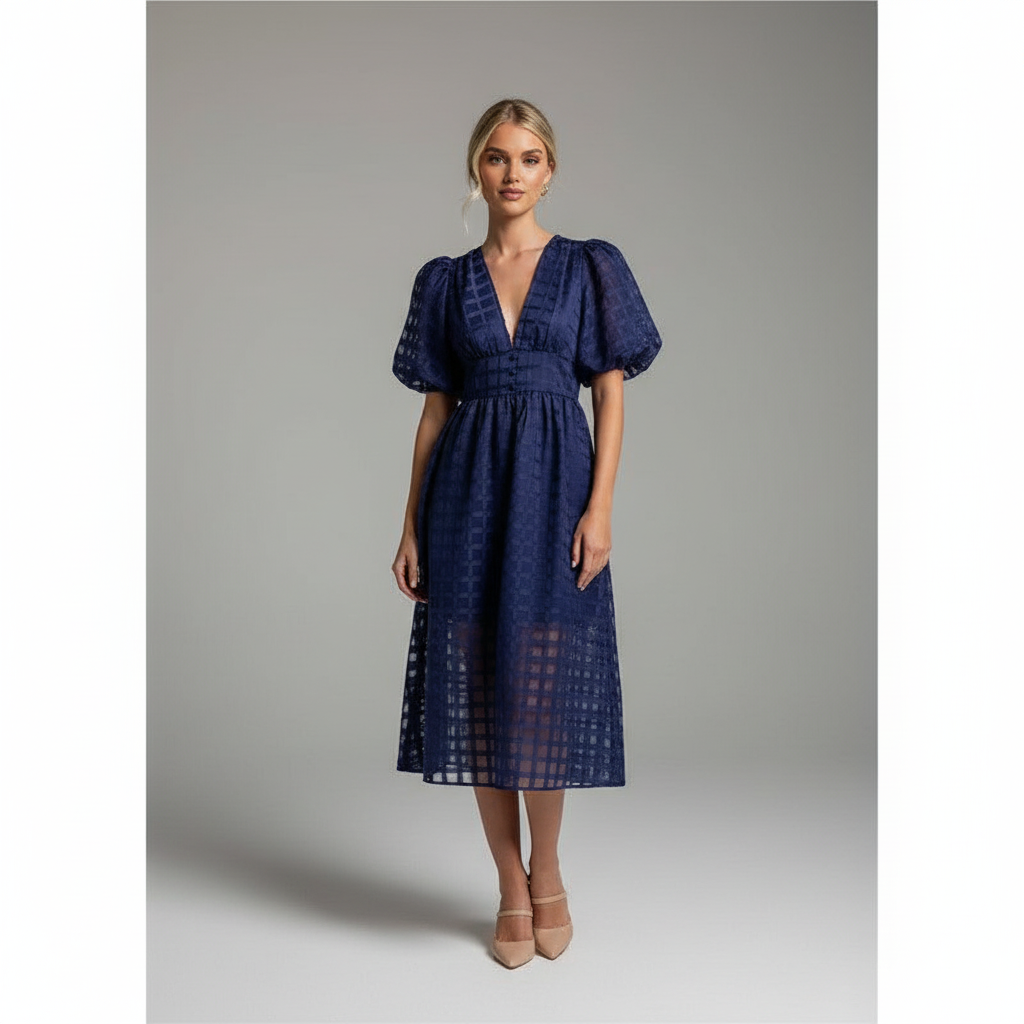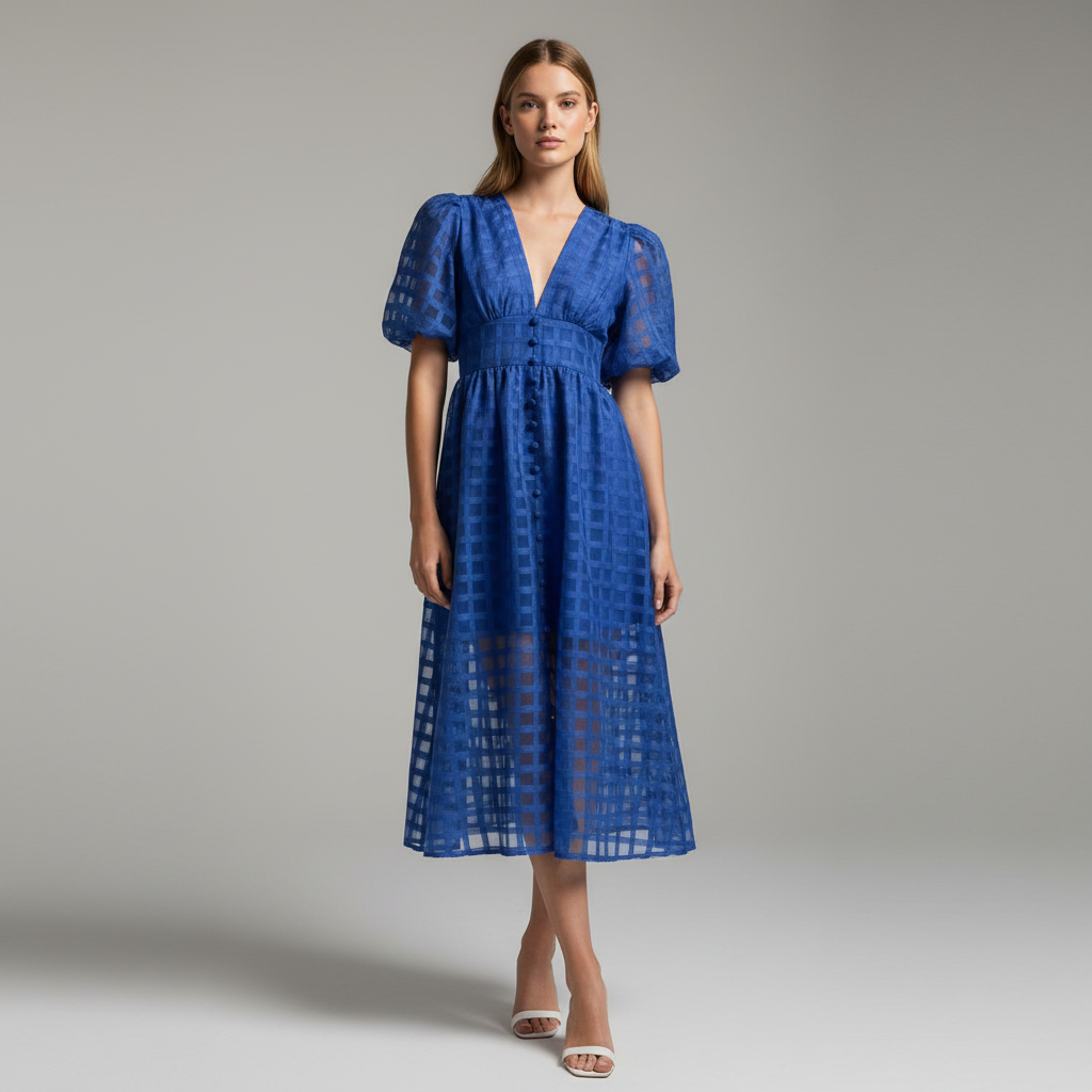 A breezy midi dress featuring a sheer grid overlay that brings subtle texture and modern flair to a timeless silhouette. The puff sleeves and deep V neckline add a feminine touch, while the fitted waist creates a flattering shape. Ideal for warm-weather days when you want to feel both stylish and effortless.