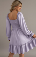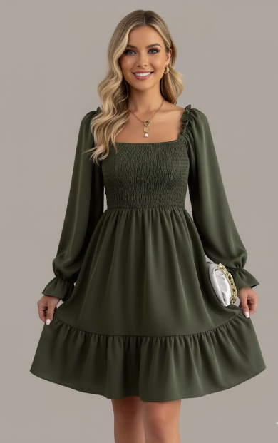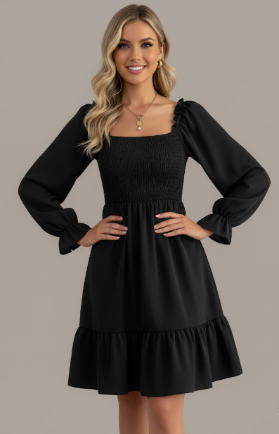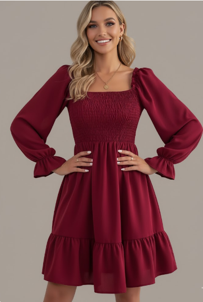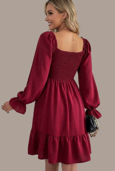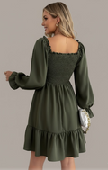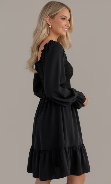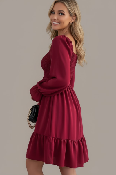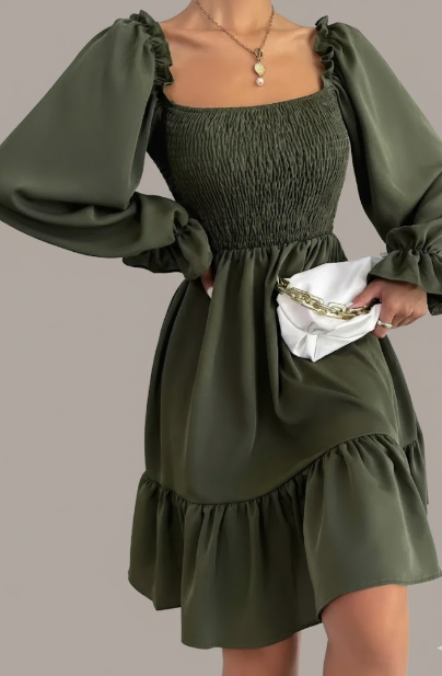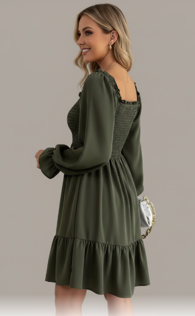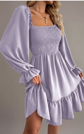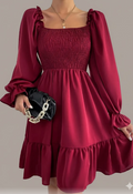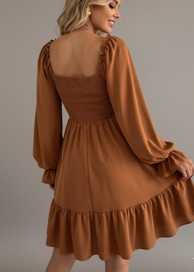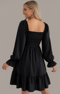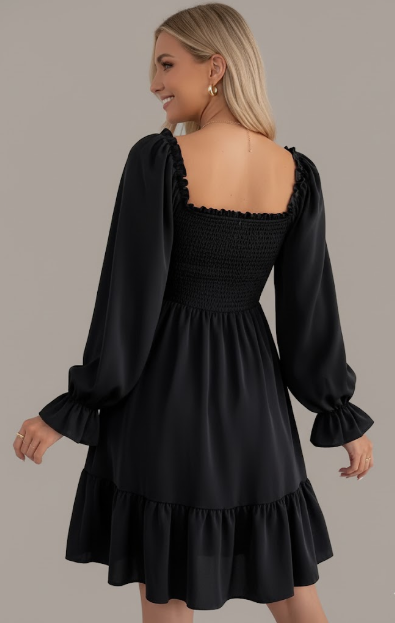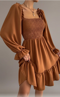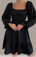 A romantic mini dress featuring a flattering shirred bodice, voluminous long sleeves with ruffled cuffs, and a flowy tiered hem. Its soft, structured silhouette is perfect for everything from daytime dates to evening dinners—elegant with just the right amount of drama.