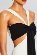 A daring yet elegant gown designed to make a statement from every angle. With its bold cutouts, flowing silhouette, and striking contrast panels, this dress brings confident sophistication to any evening affair.
