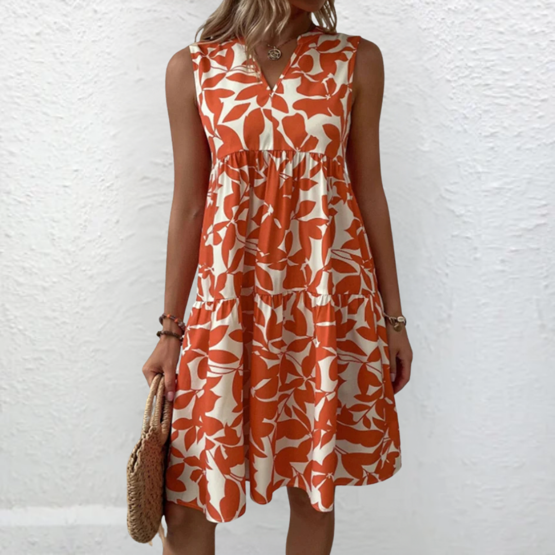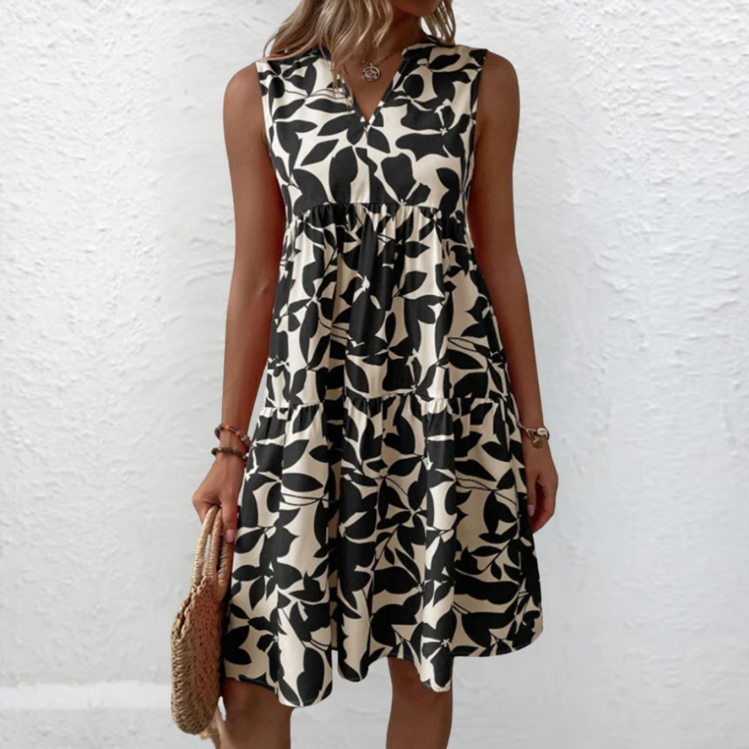Fresh, flowy, and effortlessly chic. The Sleeveless Leaf Print Dress brings nature-inspired charm to your summer wardrobe with its bold botanical print and easy silhouette. With a flattering V-neckline and breezy tiered skirt, this dress is perfect for sunny strolls, brunch dates, or weekend getaways.