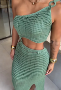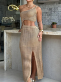 Detail: Sloping shoulder neckline, sleeveless, short top and slit skirt, irregular hem with woven accents