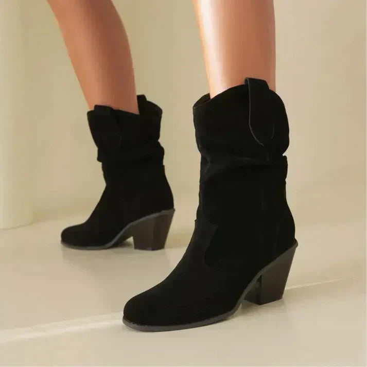 A stylish fusion of western charm and modern flair, these slouchy suede boots with a sturdy heel will elevate any outfit with effortless sophistication.