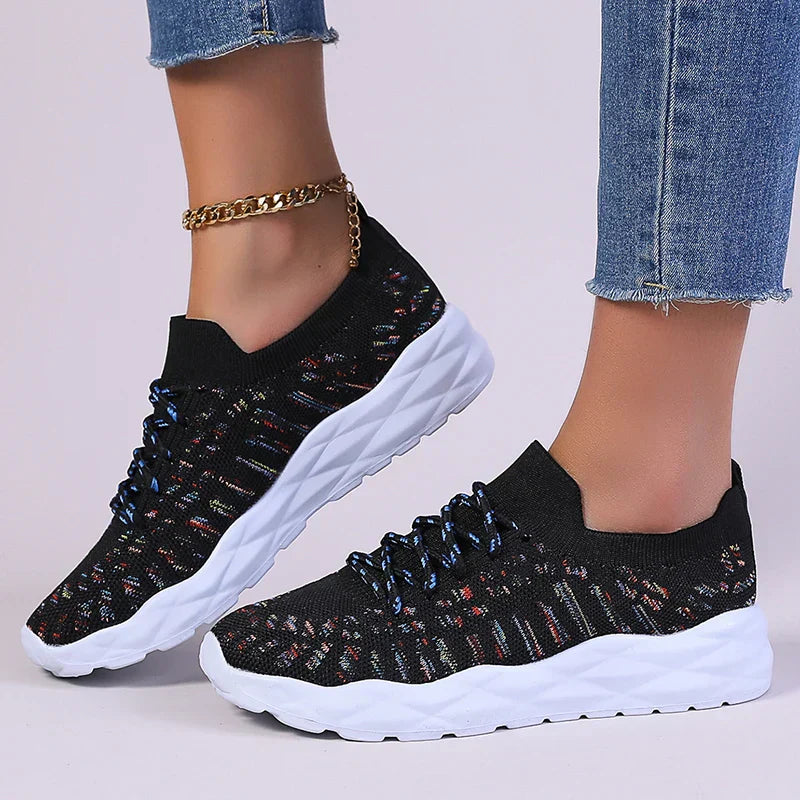Comfort-driven trainers featuring a lightweight knit upper with subtle multicolor detail and a chunky sole. Designed with a sock-like fit and lace-up front for extra support. Perfect for walking, travel, or everyday wear with a playful touch.