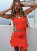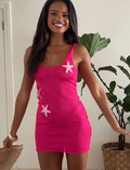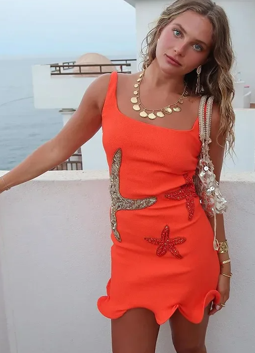 Detail: Sleeveless, square neck, mini length, sequin embellishment, ruffled hem