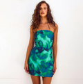 Bold and modern — this strapless mini dress features a sleek silhouette and eye-catching abstract print for standout style.