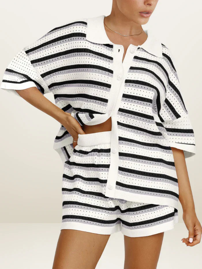 Effortless coordination — this two-piece set pairs a relaxed button-up shirt with matching high-waisted shorts for a polished yet laid-back look.