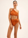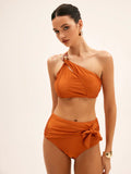 Earthy elegance meets sculptural design — this bikini set features a one-shoulder top with a tortoiseshell ring detail and high-waisted bottoms tied with a soft side knot.