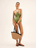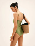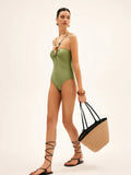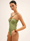 Elegant with a twist — this olive green one-piece features a subtle textured finish and a statement beaded neckline that draws the eye.