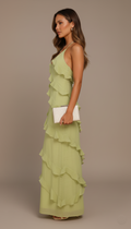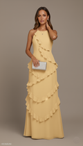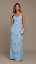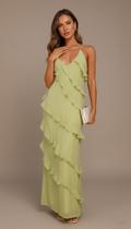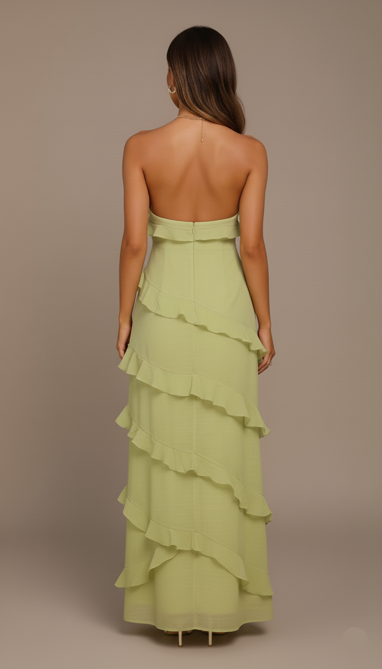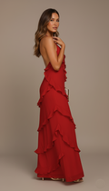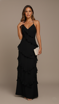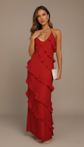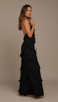 A flowing halter maxi dress featuring cascading ruffle tiers and a flattering open back. Designed with a gathered neckline and adjustable tie closure, it offers effortless elegance for both daytime and evening occasions.