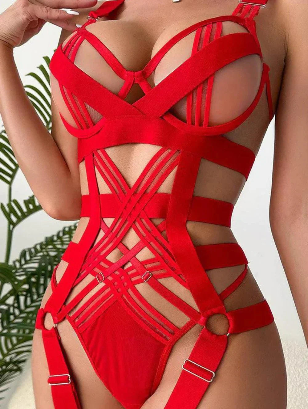 Unleash your inner seductress with the Tina Strappy Bodysuit, a bold and daring piece designed to make a statement. This bodysuit embraces your curves with its sleek, strappy design, perfect for adding a touch of edge to your lingerie collection.