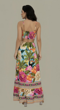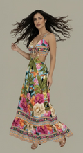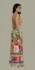 Detail: Colorful tropical floral and toucan print, side cutouts, adjustable straps, maxi length