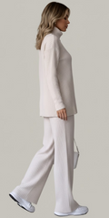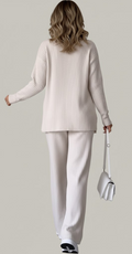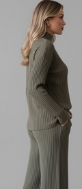 A cozy two-piece knit set featuring a relaxed turtleneck top and matching high-waisted wide leg pants. Crafted from soft cotton knit with natural stretch and a minimal silhouette. Perfect for lounging, travel, or elevated casual wear.