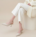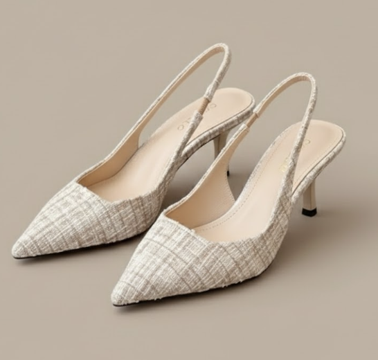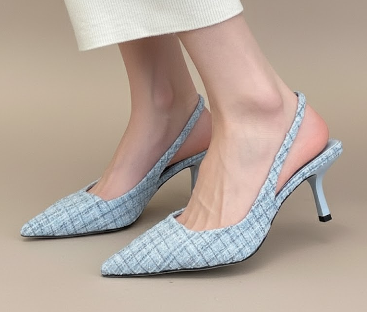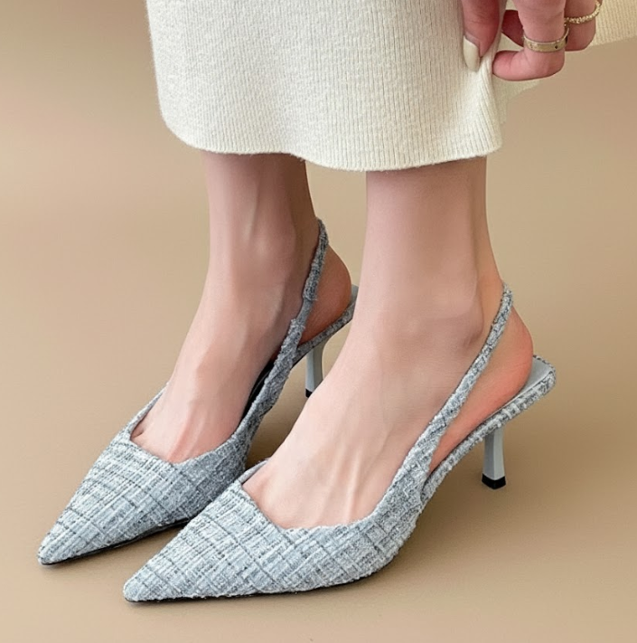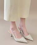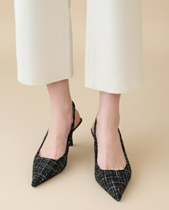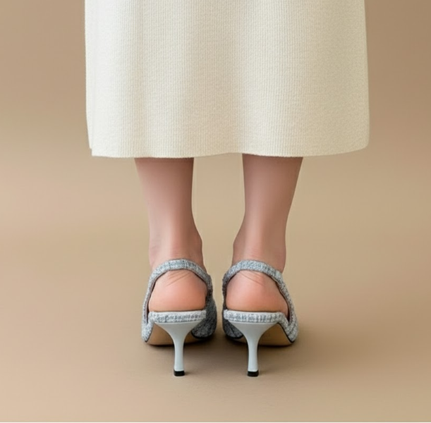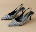 A refined heel that brings classic elegance to your everyday or evening looks. Crafted in textured tweed with a pointed toe, low kitten heel, and an adjustable slingback strap, it blends comfort and sophistication in one timeless silhouette.