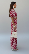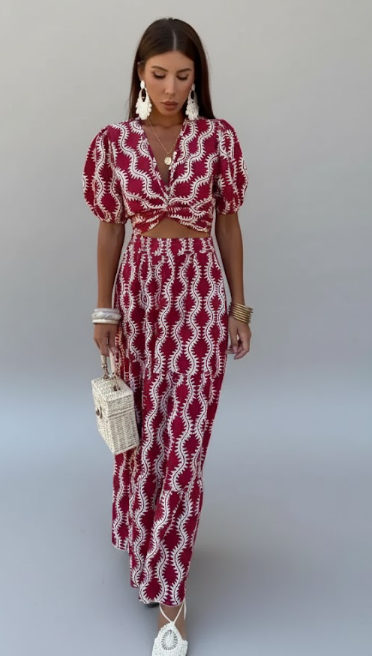 A romantic maxi dress featuring a twist-front bodice, voluminous puff sleeves, and a flowing tiered skirt. The deep V-neckline and cinched waist create a flattering silhouette, while the lightweight fabric ensures comfort and elegance for any occasion.