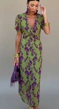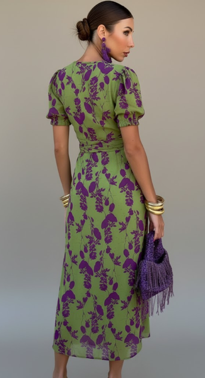 A figure-flattering midi dress that combines a deep V-neckline with softly puffed sleeves and a cinched waist, creating an effortlessly feminine shape. The bold floral print adds a vintage flair, while the side slit offers a subtle touch of allure—perfect for garden parties or sunset dinners.