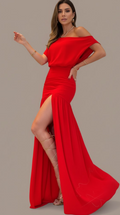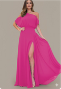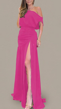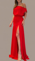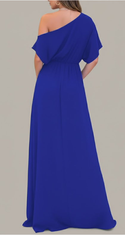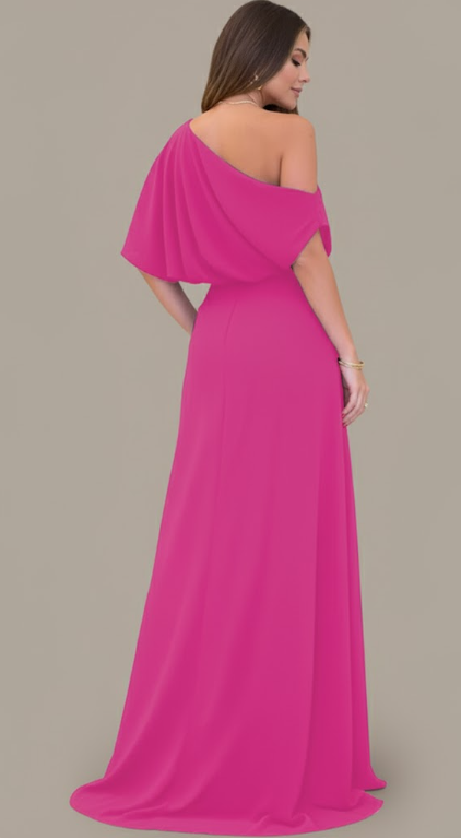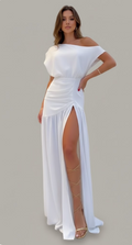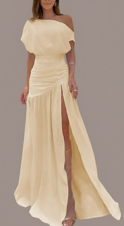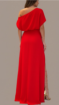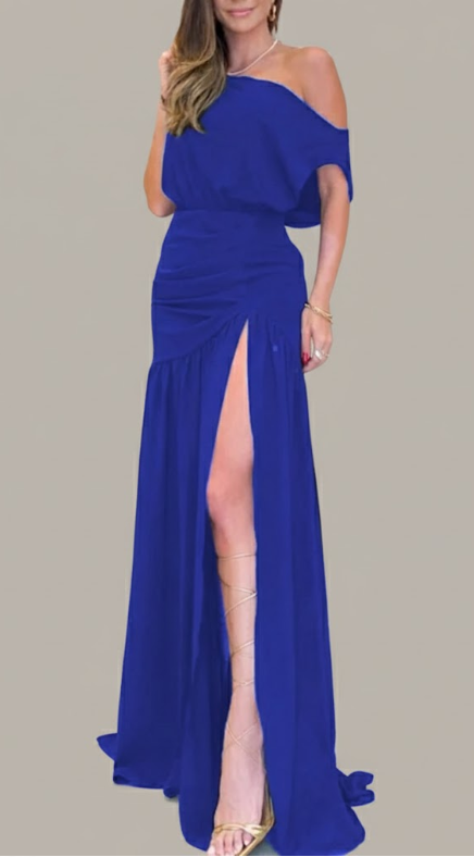 This is our Velvet Ruched One-Shoulder Slit Gown