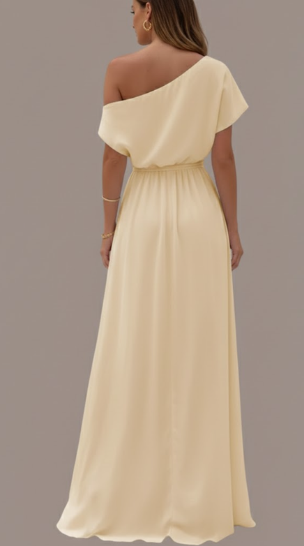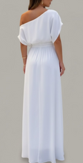 • Statement one-shoulder neckline adds sculptural elegance