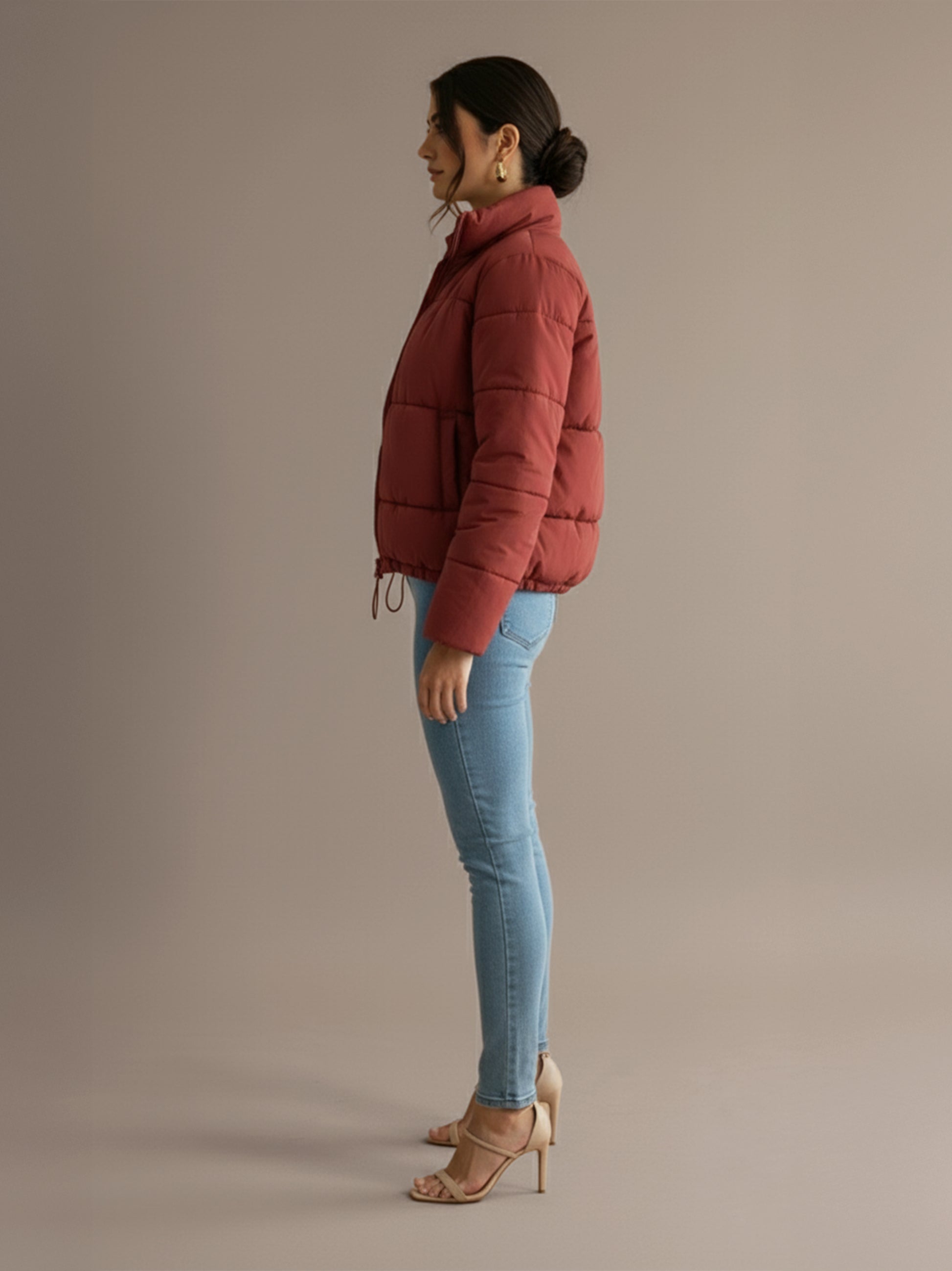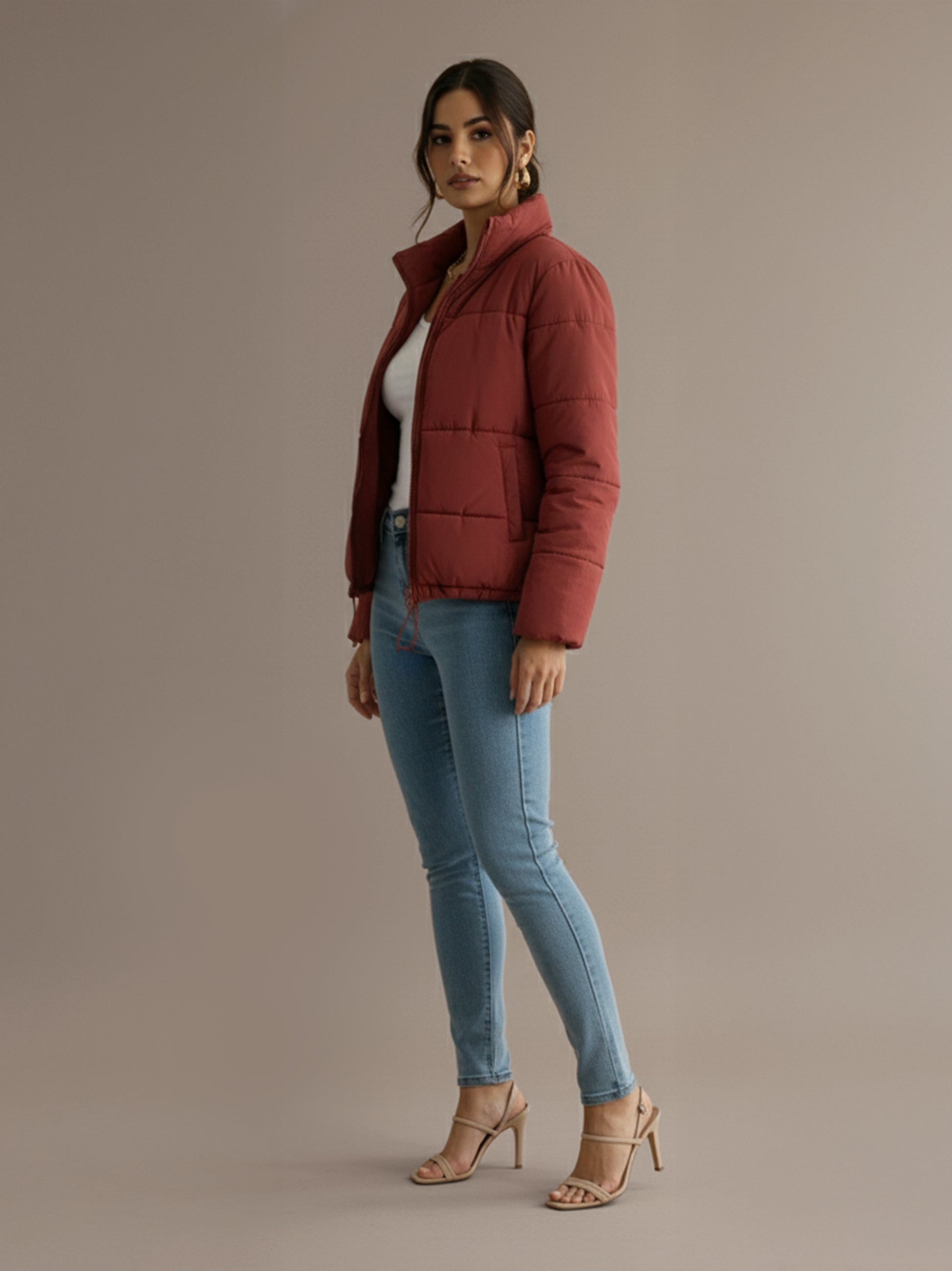 Layer the Vicky Puffer Jacket over a fitted sweater and leggings for a cozy, effortlessly stylish look.