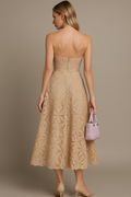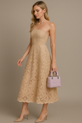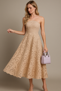This sleeveless A-line dress flows beautifully with every step, creating a graceful silhouette perfect for elegant affairs and alfresco moments. Crafted from intricate beige lace, it blends timeless charm with effortless femininity.
