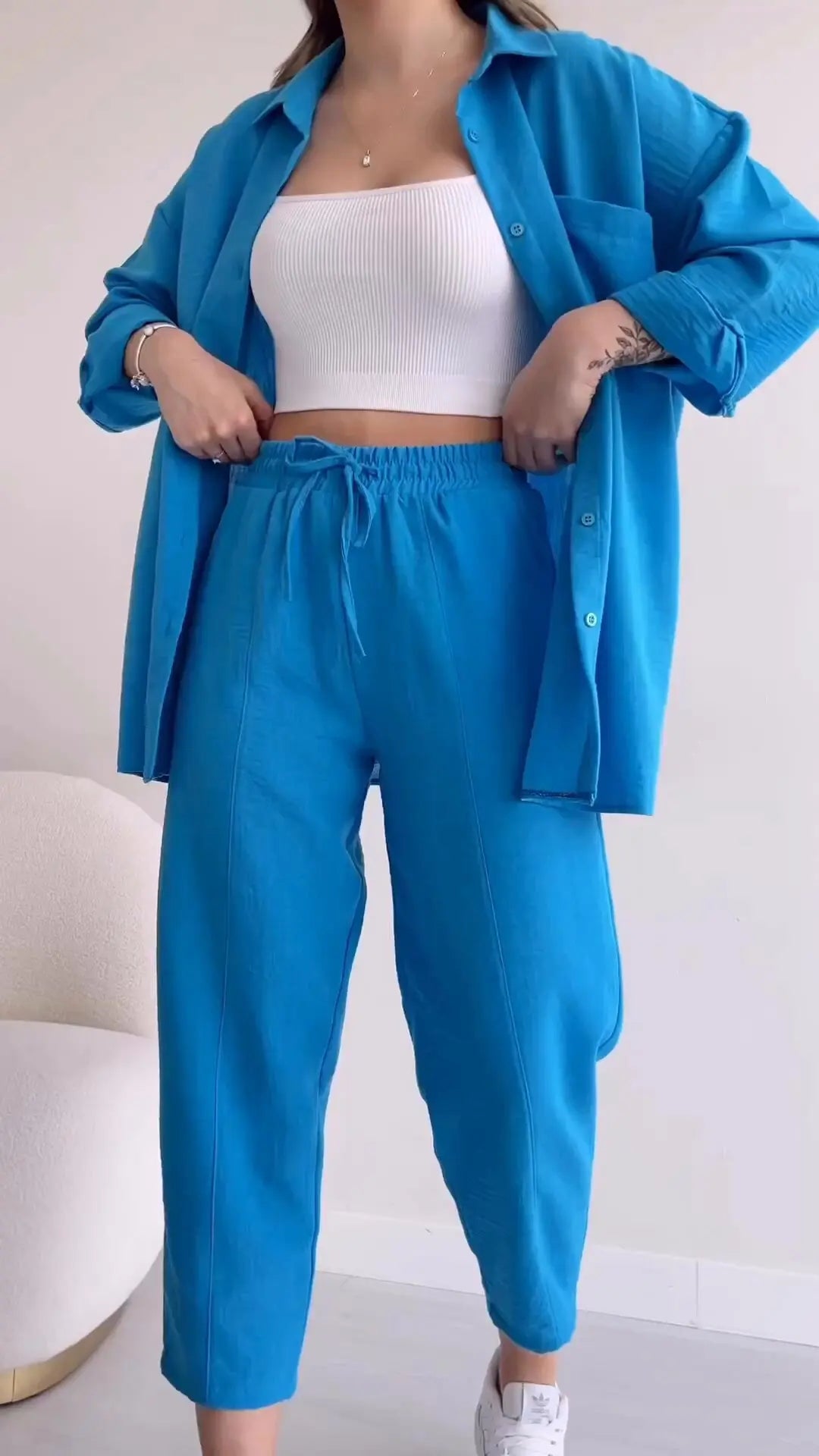 Coordinating Bottoms: Accompanied by coordinating bottoms, this set creates a cohesive and put-together look that is perfect for both casual and formal settings.