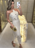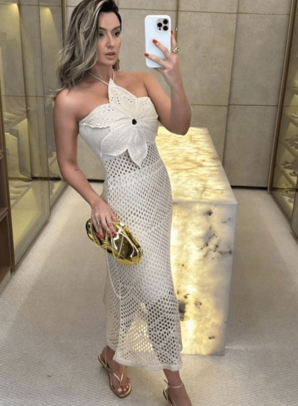 Detail: Halter neck with central floral motif and full open-knit midi skirt