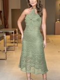 This halter-style dress is a true standout, featuring an intricate crocheted floral bodice and an airy, open-weave skirt. Perfect for summer soirées, garden gatherings, or seaside escapes, it balances elegance with artisan appeal in a refreshing sage hue.