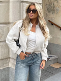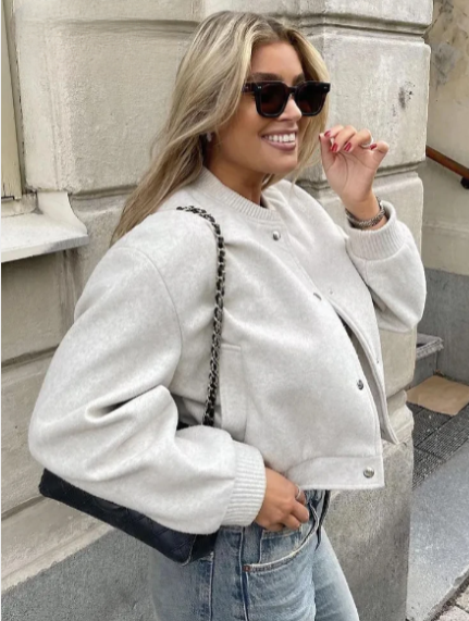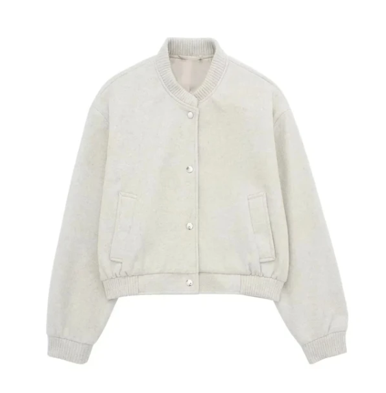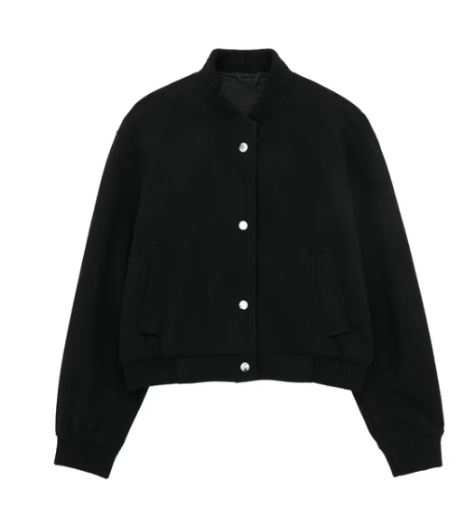 A sleek cropped jacket with a varsity-inspired silhouette, featuring soft wool texture, snap button closure, and ribbed cuffs for a clean finish. Perfect for layering over casual basics or elevating off-duty denim looks with minimal effort.