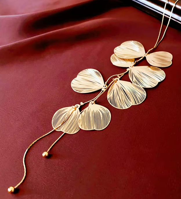 Graceful yet striking, this longline necklace features petal-shaped metal charms and flowing tassel details in a radiant gold finish. Designed to drape beautifully across the neckline, it’s a delicate statement piece perfect for weddings, parties, and elegant evenings out.