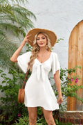 A breezy mini dress designed with soft flutter sleeves and a playful front knot detail. The relaxed silhouette flatters effortlessly, making it perfect for daytime adventures, vacations, or just soaking in the sunshine.
