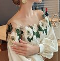This is our Off Shoulder Long Sleeve Pleated Blouse