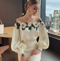 An off-the-shoulder blouse with a softly draped neckline and pleated detailing through the bodice. Designed with long sleeves and a lightweight fabric for a relaxed, elegant silhouette. A refined piece for effortless day-to-evening styling.