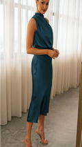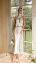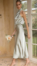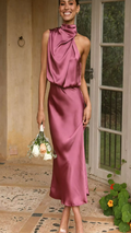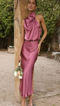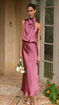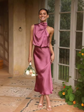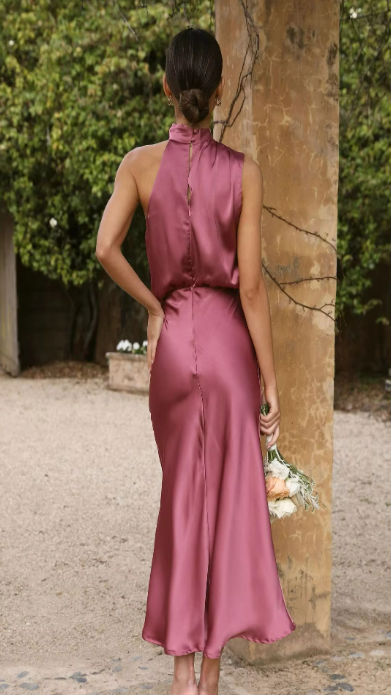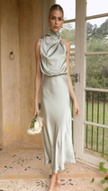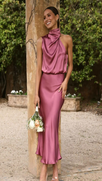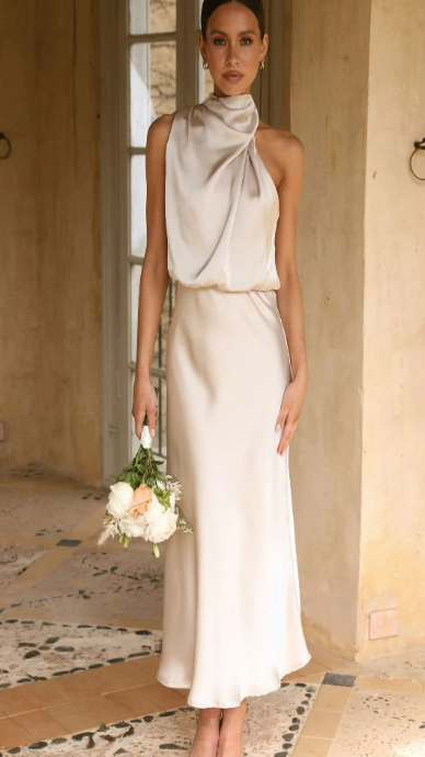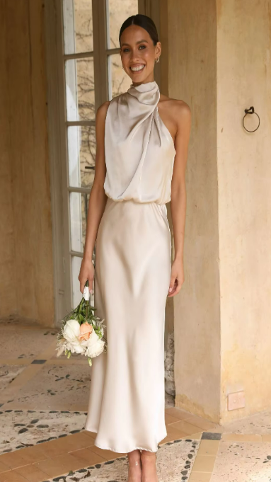 Elegant yet effortless, this midi slip dress features a softly draped one-shoulder neckline and a bias-cut silhouette that flatters every curve. The satin finish catches the light with a fluid shine, perfect for weddings, garden parties, or evening celebrations.