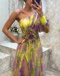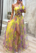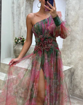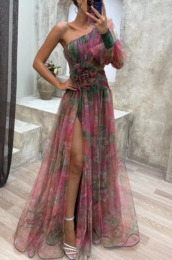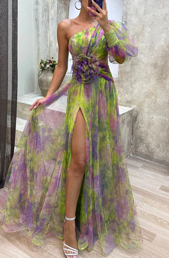 Detail: One-shoulder sleeve, waist flower detail, front slit, sheer layered skirt
