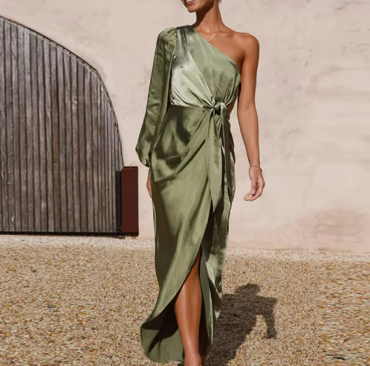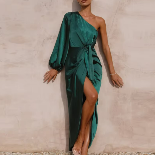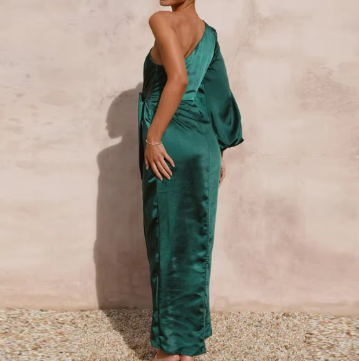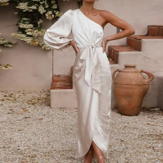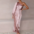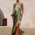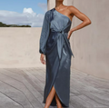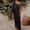 A luxurious satin midi featuring a striking one-shoulder silhouette and a voluminous sleeve that adds dramatic elegance. The waist tie cinches perfectly above the wrapped skirt, creating an effortlessly polished shape. Ideal for evening soirées, formal garden parties, or elevated resort dinners.