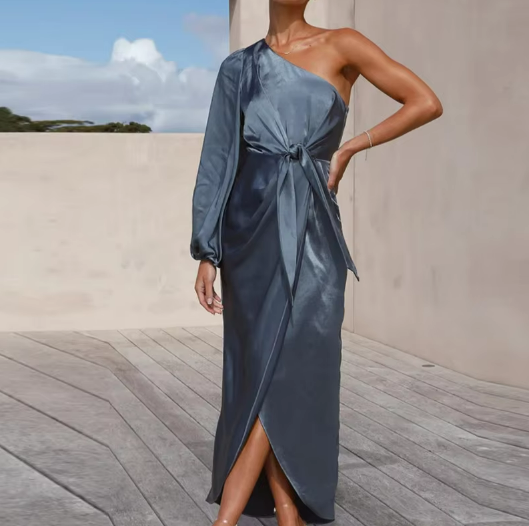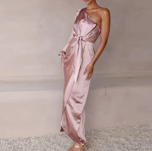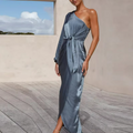This is our One-Shoulder Satin Tie Dress