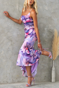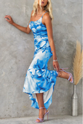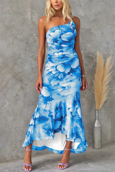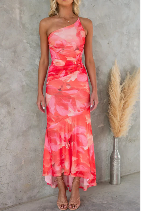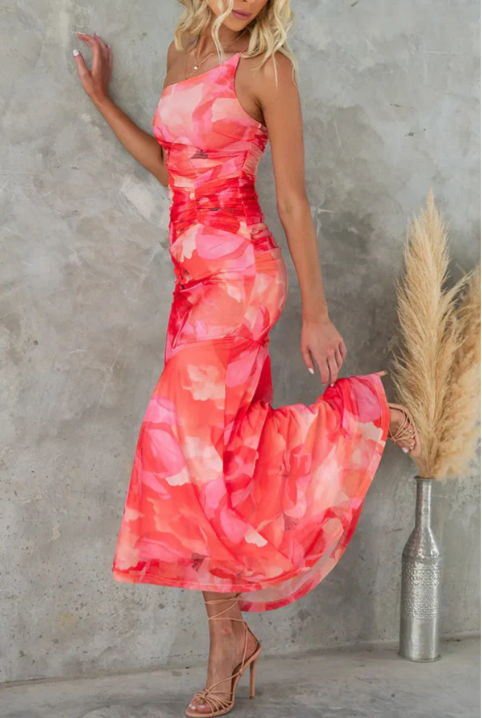 An elegant one-shoulder silhouette meets a soft ruched bodice and dreamy flared hem. This floral dress hugs your shape in all the right places, with a painterly print that flows like petals in motion. Perfect for garden parties, evening dinners, or summer weddings.