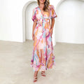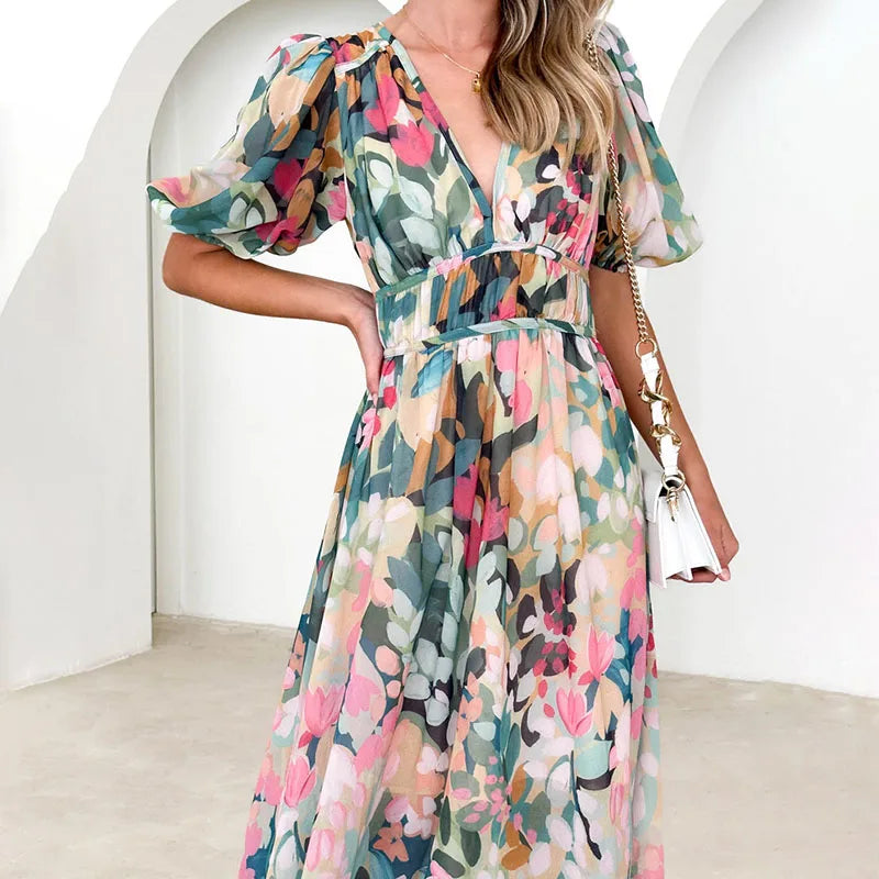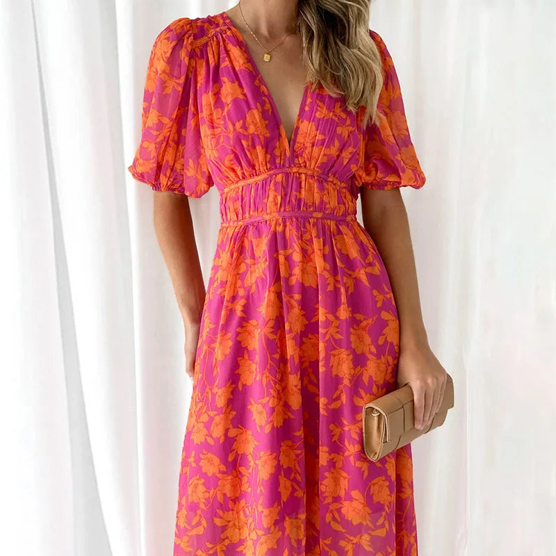 This is our Pink and Orange Puff Sleeve Maxi Dress