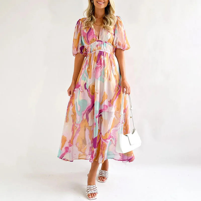 Step into this dress when you want to feel unforgettable — bold hues and soft lines create magic in motion.