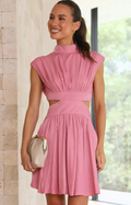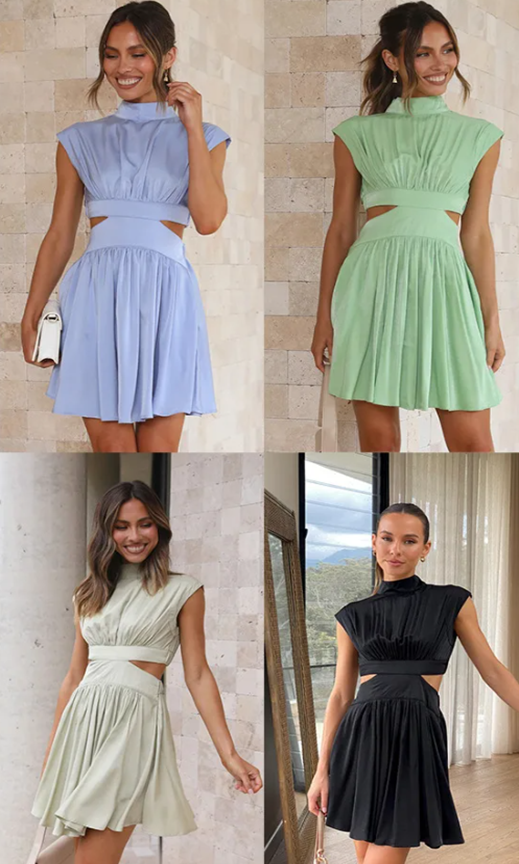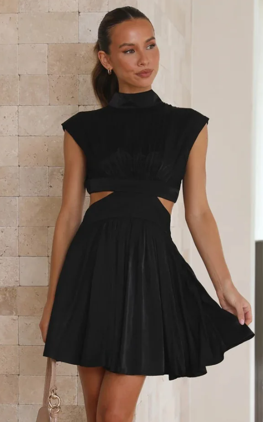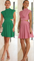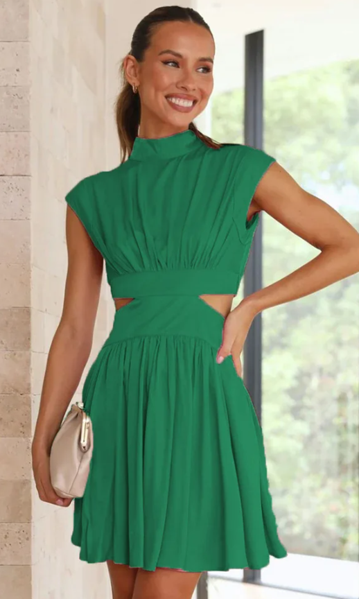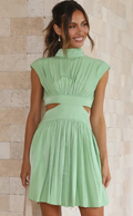 Detail: Sleeveless cut, high neckline, pleated texture, and mini length