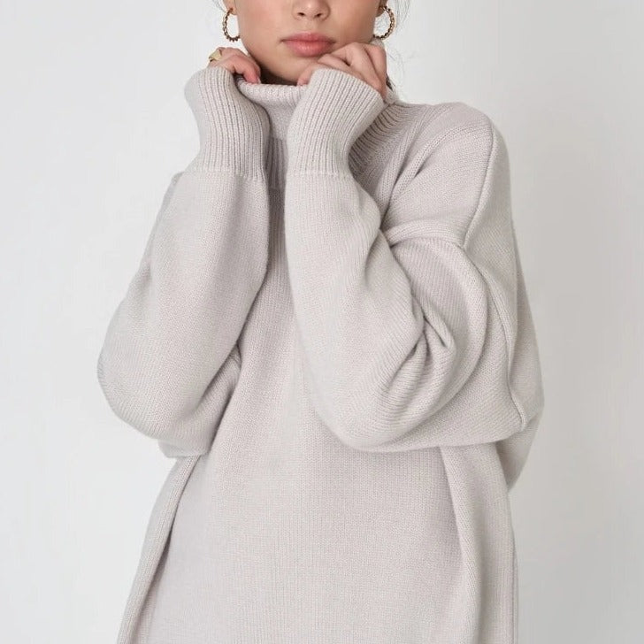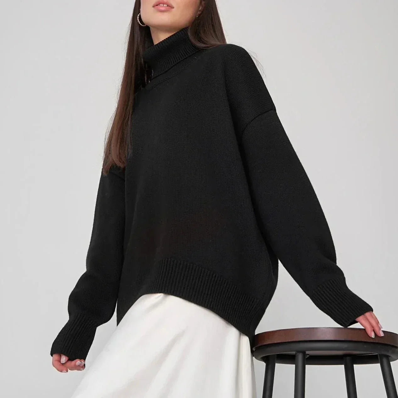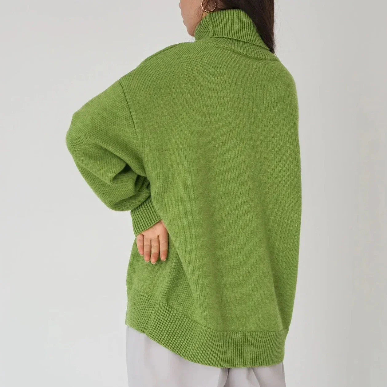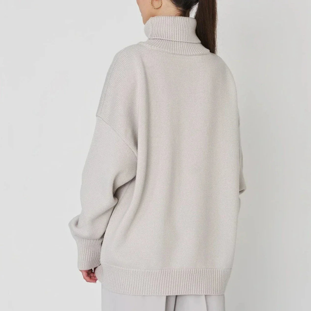 A plush knit sweater with a cozy turtleneck and softly oversized silhouette. Designed for warmth and ease, featuring ribbed trims and long sleeves with a natural drape. A cold-weather staple that layers effortlessly.