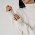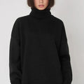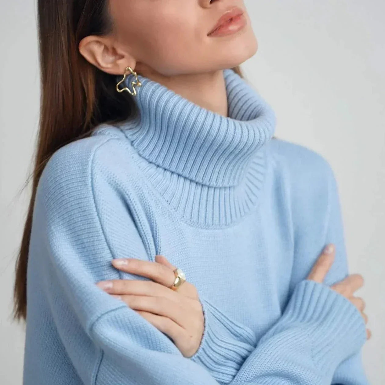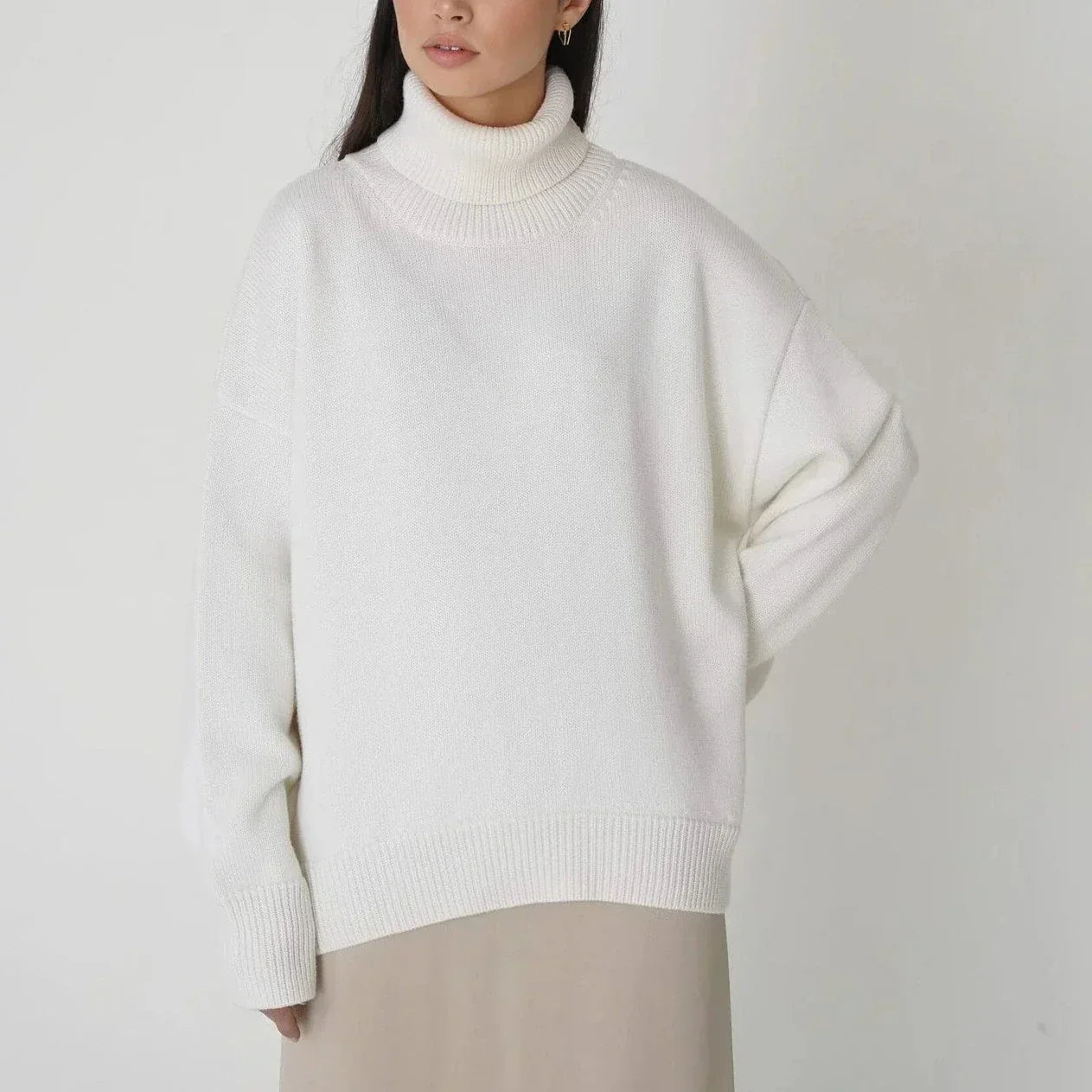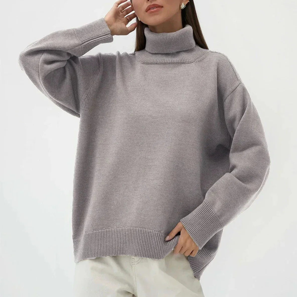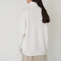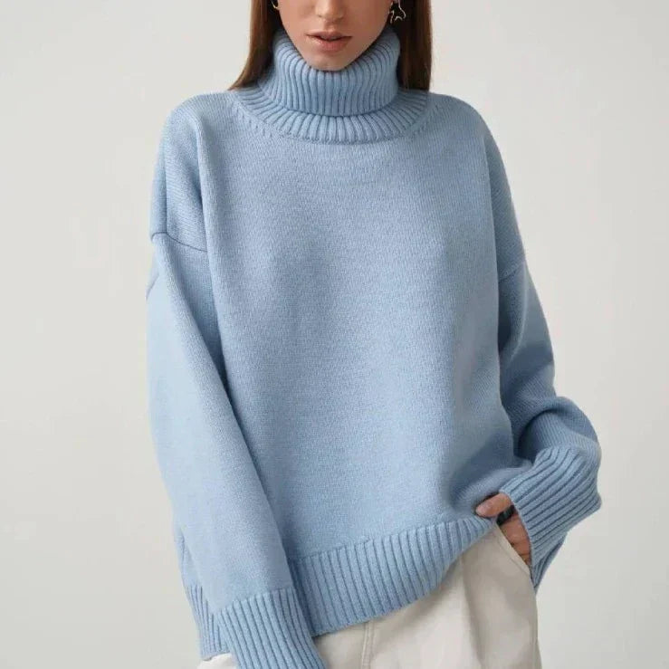 A plush knit sweater with a cozy turtleneck and softly oversized silhouette. Designed for warmth and ease, featuring ribbed trims and long sleeves with a natural drape. A cold-weather staple that layers effortlessly.