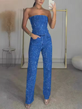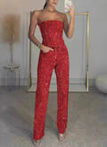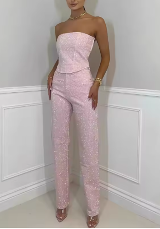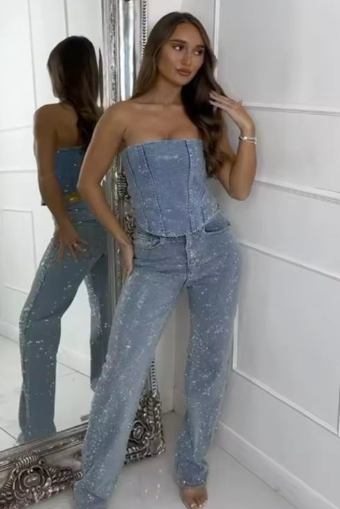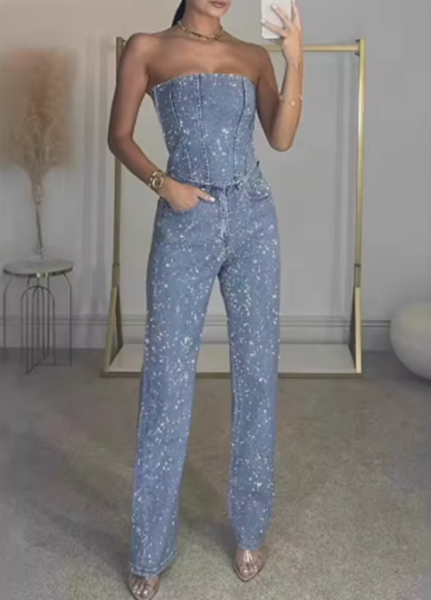 Detail: Tube-style crop top, backless with full sequin front, high-rise jeans with bold zippers