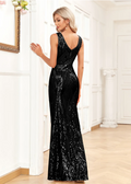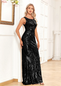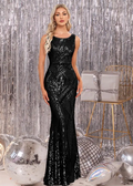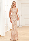 A stunning full-length gown featuring allover sequin detailing in a striking geometric pattern. Designed with a high neckline and a sleeveless silhouette, this figure-flattering piece adds just the right amount of drama for weddings, galas, or any special evening event.