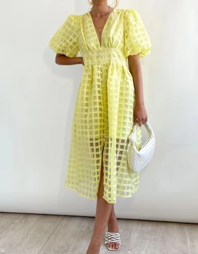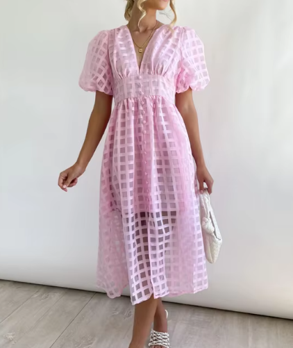 A breezy midi dress featuring a sheer grid overlay that brings subtle texture and modern flair to a timeless silhouette. The puff sleeves and deep V neckline add a feminine touch, while the fitted waist creates a flattering shape. Ideal for warm-weather days when you want to feel both stylish and effortless.