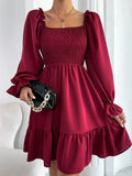 A romantic mini dress featuring a flattering shirred bodice, voluminous long sleeves with ruffled cuffs, and a flowy tiered hem. Its soft, structured silhouette is perfect for everything from daytime dates to evening dinners—elegant with just the right amount of drama.
