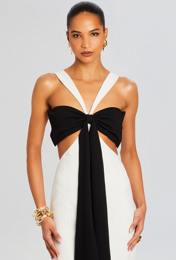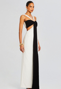 A daring yet elegant gown designed to make a statement from every angle. With its bold cutouts, flowing silhouette, and striking contrast panels, this dress brings confident sophistication to any evening affair.